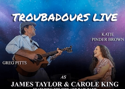 Troubadours Live is a heartfelt celebration of the legendary Troubadour Reunion Tour, faithfully recreating the sound, sights and emotions of James Taylor and Carole King at their very best. These two iconic singer-songwriters shaped the soundtrack of a generation, dominating the airwaves and selling tens of millions of records with unforgettable hits like It’s Too Late, Baby, Carolina in My Mind, Fire & Rain, and You’ve Got a Friend.